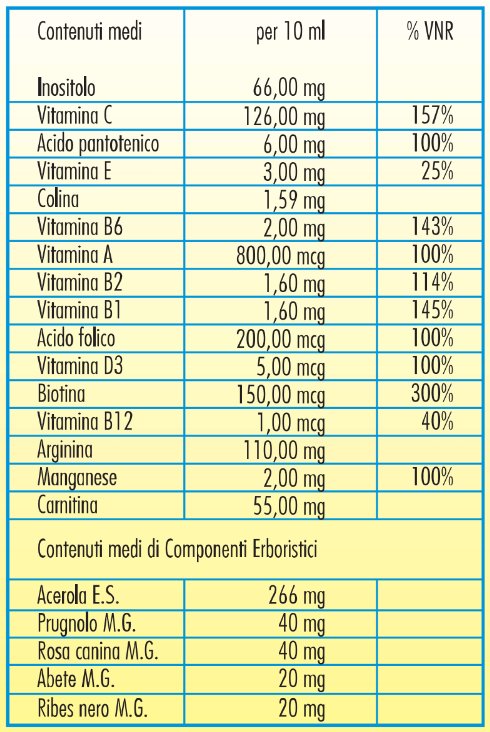 VITAMINE: Vitamina A, Vitamina B1, Vitamina B2, Vitamina B5, Vitamina B6, Vitamina B12, Vitamina C, Vitamina D, Vitamina E, Acido folico, Biotina, Colina; AMINOACIDI: Arginina, Carnitina; OLIGOELEMENTI: Manganese gluconato; ESTRATTI VEGETALI: Acerola (e.s.), gemme di Abete (M.G.), Ribes nero (M.G.), Prugnolo (M.G.), Rosa canina (M.G.).