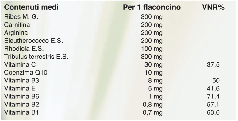 Eleutherococcus senticosus (e.s.), Arginina, Carnitina, Tribulus terrestris (e.s.), Rhodiola rosea (e.s.), Ribes nigrum (M.G.), Coenzima Q10, Calcio, Magnesio, Potassio, Vitamina B1, B2, B3, B6, Vitamina C, Vitamina E, succo di Mirtillo bacche.