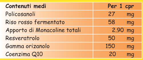 Policosanoli da cera di canna da zucchero e.s., Riso rosso fermentato e.s. (Monacolina k), Gamma orizanolo, Resveratrolo, Coenzima Q10.