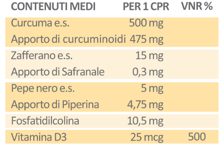 Curcuma (Curcuma longa L.) rizoma e.s. tit. 95% curcuminoidi; Agente di carica: Cellulosa microcristallina; Agenti antiagglomeranti: Biossido di silicio, Sali di magnesio degli acidi grassi; Polivinilpirrolidone; Fosfatidilcolina 30% (derivato della soia); Zafferano (Crocus sativus L.) stigmi e.s. tit. 2% Safranale; Monolaurato di poliossietilene sorbitano; Vitamina D3 (Colecalciferolo); Pepe nero (Piper nigrum L.) frutti e.s. tit. 95% Piperina.
