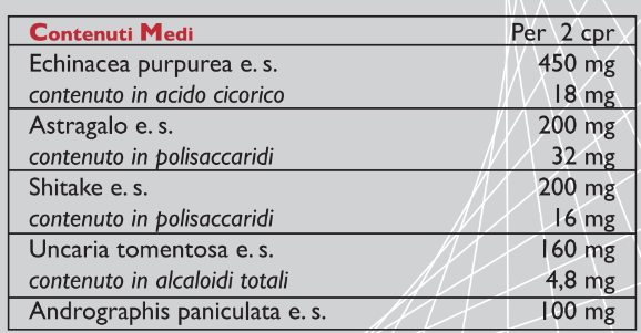 Le compresse contengono: Andrographis paniculata e.s. (95% in andrographolidi), Astragalus membranaceus e.s. (16% polissaccaridi), Echinacea purpurea e.s. (4% in acido cicorico), Lentinus edodes (Shitake) e.s. (8% in polisaccaridi), Uncaria tomentosa e.s. (3% in alcaloidi totali).