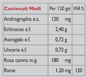 Le gocce contengono: Andrographis paniculata e.s. (95% in andrographolidi), Astragalus membranaceus e.f. , Echinacea purpurea e.f., Rosa canina M.G., Uncaria tomentosa e.f. , Rame gluconato.