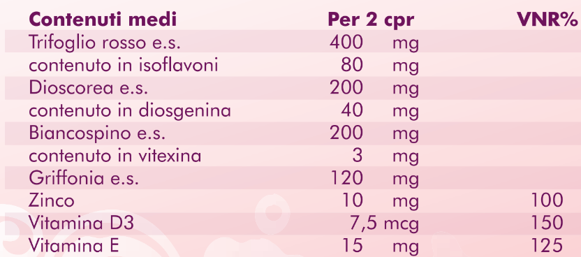Trifoglio rosso fiori e.s.* (Trifolium pratense L.) 20% isoflavoni; Dioscorea selvatica rizoma e.s.* (Dioscorea villosa L.) 20% diosgenina; Biancospino fiori e.s.* (Crataegus oxyacantha Auct) 1,5% vitexina; Agente di carica: Cellulosa microcristallina; Griffonia semi e.s.* (Griffonia simplicifolia (DC.) Baill.); Zinco gluconato; Agenti antiagglomeranti: Sali di magnesio degli acidi grassi, Biossido di silicio; Vitamina E (Acetato di DL-α-tocoferile); Vitamina D3 (Colecalciferolo).