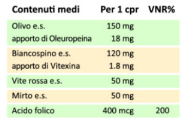Agente di carica: Cellulosa microcristallina; Olivo (Olea europaea L.) foglie e.s. tit. 12% Oleuropeina; Biancospino (Crataegus laevigata (Poir.) DC.) fiori e foglie e.s. tit. 1,5% Vitexina; Vite rossa (Vitis vinifera L.) semi e.s.; Mirto (Myrtus communis L.) foglie e.s.; Antiossidante: Palmitato di ascorbile; Agenti antiagglomeranti: Sali di magnesio degli acidi grassi, Biossido di silicio; Acido folico.