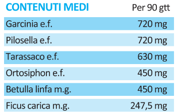 Tarassaco (Taraxacum officinale (L.) Weber ex F.H.WIGG) radice e.f.; Betulla (Betula pendula Roth) linfa m.g.; Ortosiphon (Orthosiphon aristatus (Blume) Miq.) foglie e.f.; Fico (Ficus carica L.) gemme m.g.; Glicerina.
