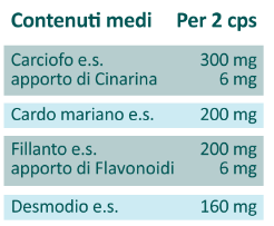Carciofo (Cynara scolymus L.) foglie e.s.* tit. 2% Cinarina; Idrossi-propil-metilcellulosa; Cardo mariano (Silybum marianum L. Gaertn) frutti e.s.; Fillanto (Phyllanthus niruri L.) erba e.s. tit. 3% Flavonoidi; Desmodio (Desmodium adscendens (Sw.) D.C.) foglie e.s.*; Agenti antiagglomeranti: Sali di magnesio degli acidi grassi, Biossido di silicio; Calcio carbonato; Calcio fosfato.