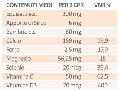 Equiseto (e.s.), Bambù (e.s.), Calcio, Ferro, Magnesio, Selenio, Vitamina C, Vitamina D3.