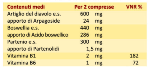 Artiglio del diavolo (e.s.), Boswellia (e.s.), Tanaceto partenio (e.s.), Vitamina B1, Vitamina B6.