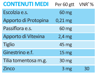 Acqua; Miele di Tiglio; Alcool; Escolzia (Eschscholtzia californica Cham.) erba e.s. tit. 0,35% Protopina; Tiglio (Tilia platyphyllos Scop.) fiori e.f.; Passiflora (Passiflora incarnata L.) erba con fiori e.s. tit. 4% Vitexina; Tiglio (Tilia tomentosa Moench) gemme m.g.; Glicerina; Zinco gluconato; Ginestrino (Lotus corniculatus L.) fiori e.f.; Edulcorante: Glicosidi dello steviolo.