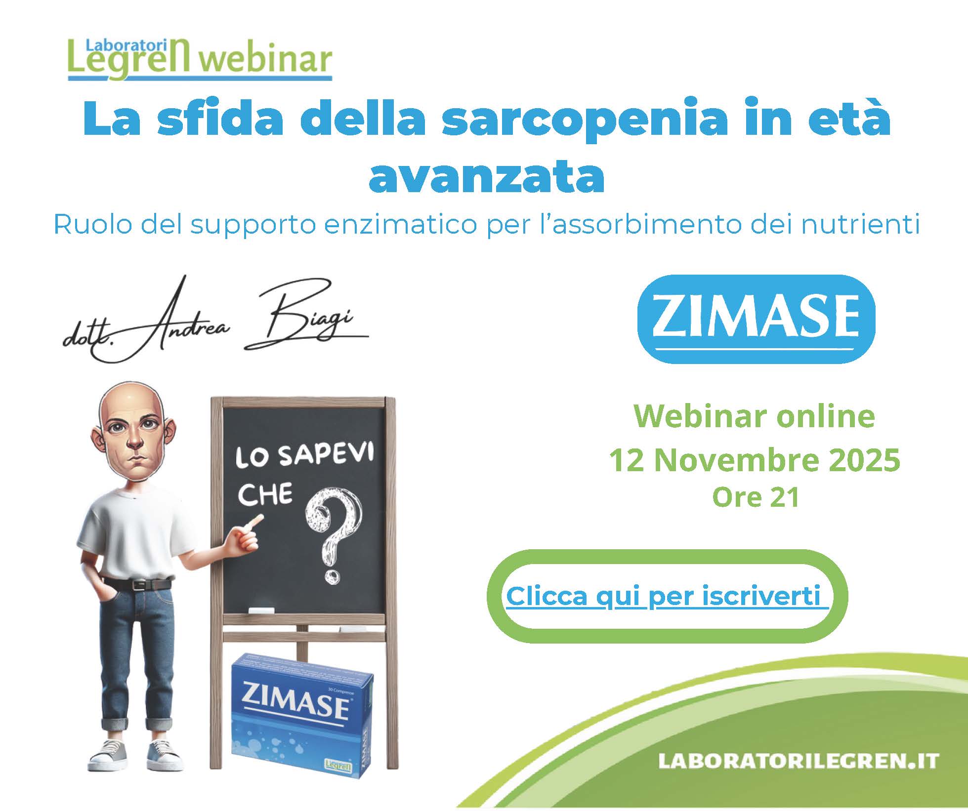 Proseguono i Webinar in pillole a cura del Dott. Andrea Biagi. Il 12 novembre 2025 sarà dedicato a La sfida della sarcopenia in età avanzata (Zimase).