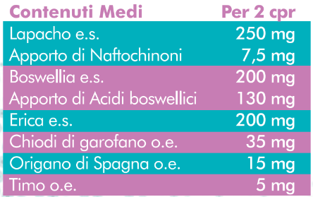 Lapacho (Tabebuia avellanedae Lorenzn ex Griseb) e.s. tit. 3% Naftochinoni; Boswellia (Boswellia serrata Roxb. ex Colebr.) resina e.s. tit. 65% Acidi boswellici; Erica (Erica cinerea L.) foglie con fiori e.s.; Agente di carica: Cellulosa microcristallina; Agenti di rivestimento: Idrossipropilmetilcellulosa, carbossimetilcellulosa sodica, Calcio carbonato, Sorbitolo, Sodio alginato; Agenti antiagglomeranti: Biossido di silicio, Sali di magnesio degli acidi grassi, Acido stearico, Talco; Chiodi di garofano (Syzygium Aromaticum (L.) Merr et L.M.Perry) o.e.; Origano di spagna (Origanum vulgare L.) o.e.; Timo (Thymus vulgaris L.) o.e.; Glicerolo vegetale; Calcio fosfato tribasico.