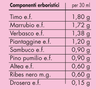 Stabilizzante: Sciroppo di Maltitolo; Acqua; Timo foglie e.f. (Thymus vulgaris L.); Marrubio foglie e.f. (Marrubium vulgare L.); Verbasco fiori e.f. (Verbascum thapsus L.); Piantaggine erba con fiori e.f. (Plantago major L.); Sambuco frutti e.f. (Sambucus nigra L.); Pino pumilio gemme e.f. (Pinus mugo Turra); Altea radice e.f. (Althaea officinalis L.); Ribes gemme m.g. (Ribes nigrum L.); Drosera erba con fiori e.f. (Drosera rotundifolia L.); Maltodestrine; Glicerolo; Conservanti: Benzoato di Sodio, Sorbato di Potassio; Antiossidanti: Acido ascorbico; Aromi.