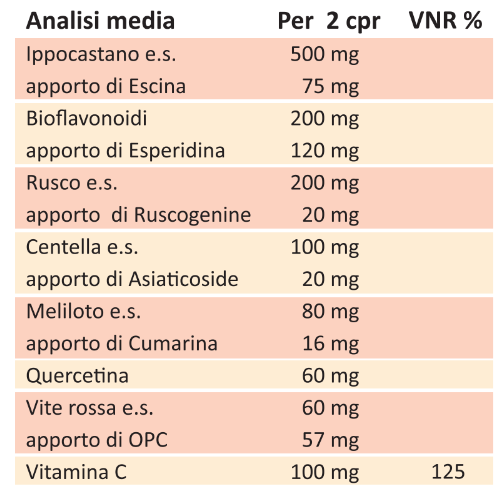 Bioflavonoidi da agrumi tit. 60% Esperidina; Rusco (Ruscus aculeatus L.) rizoma e radici e.s. tit. 10% Ruscogenine; Vitamina C protetta (Acido L-ascorbico); Centella (Centella asiatica (L.) urb) erba e.s. tit. 20% Asiaticoside; Meliloto (Melilotus officinalis L. Pallas) erba con fiori e.s. tit. 20% Cumarina; Vite Rossa (Vitis vinifera L.) semi e.s. tit. 95% OPC; Quercetina; Agenti antiagglomeranti: Sali di magnesio degli acidi grassi, Biossido di silicio; Carbossimetilcellulosa sodica reticolata.