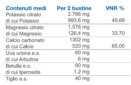 Potassio citrato, Magnesio citrato, Calcio carbonato, Uva ursina (e.s.), Betulla (e.s.), Tiglio (e.s.).