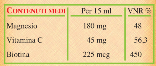 Acqua; Stabilizzante: Sorbitolo sciroppo; Magnesio cloruro; Vitamina C (Acido L-ascorbico); Conservante: Benzoato di sodio; Aromi; Betacarotene; Biotina.