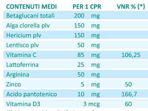 Betaglucani, Alga clorella, Hericium, Lentisco, Lattoferrina, Arginina, Zinco, Acido pantotenico Vitamina C, Vitamina D.