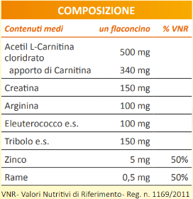 Acetil L-Carnitina, Creatina, Arginina, Eleuterococco e.s., Tribolo e.s., Zino, Rame
